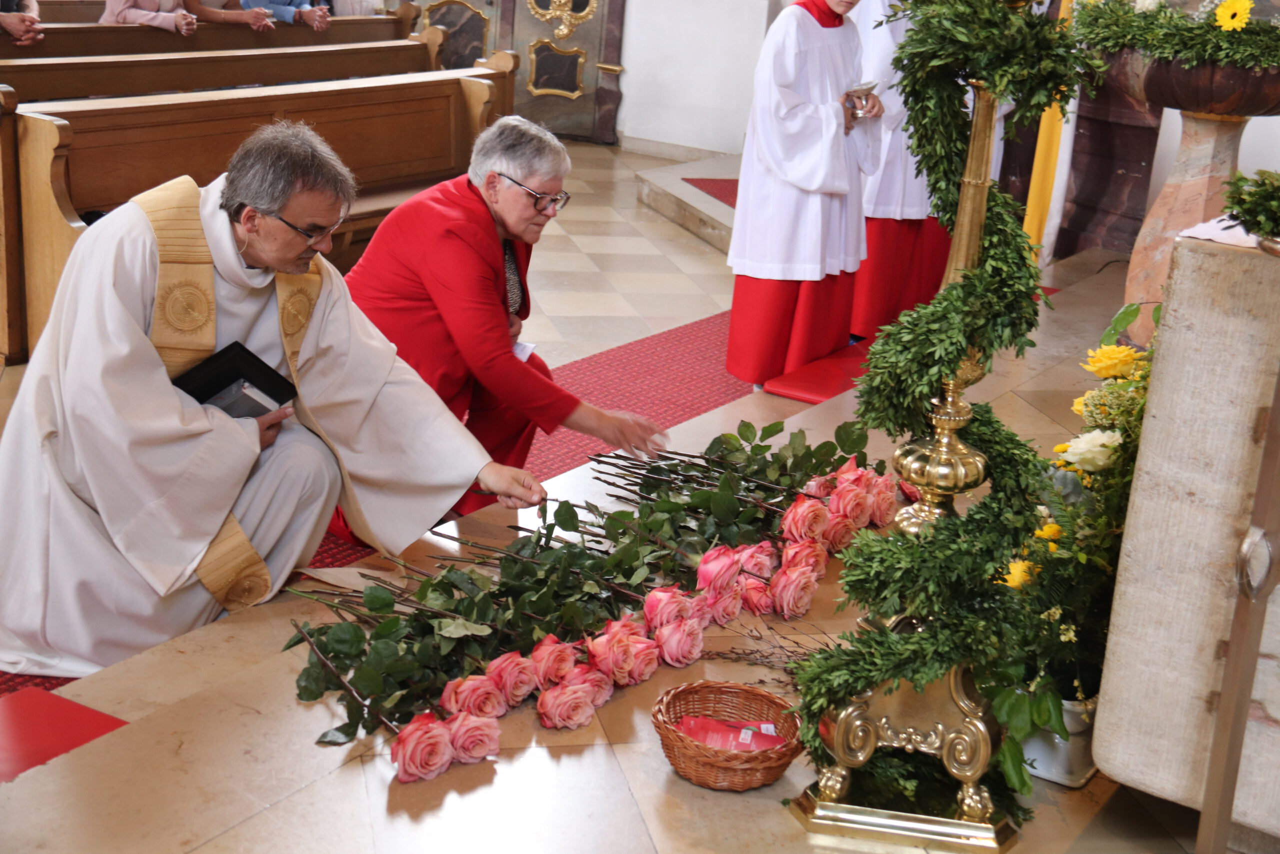 Bei der gemeinsamen Dankandacht am Sonntag brachten die Kinder Rosen zur Verehrung des Allerheiligsten zum Altar und legten die Rosen vor der Monstranz ab.