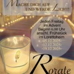 Besinnung im Advent LichtZeit jeden Dienstag um 21 Uhr: die Andacht zum Tagesabschluss in der Lorettokapelle Rorate jeden Freitag um 6 Uhr: die Messe im Kerzenschein in der Pfarrkirche